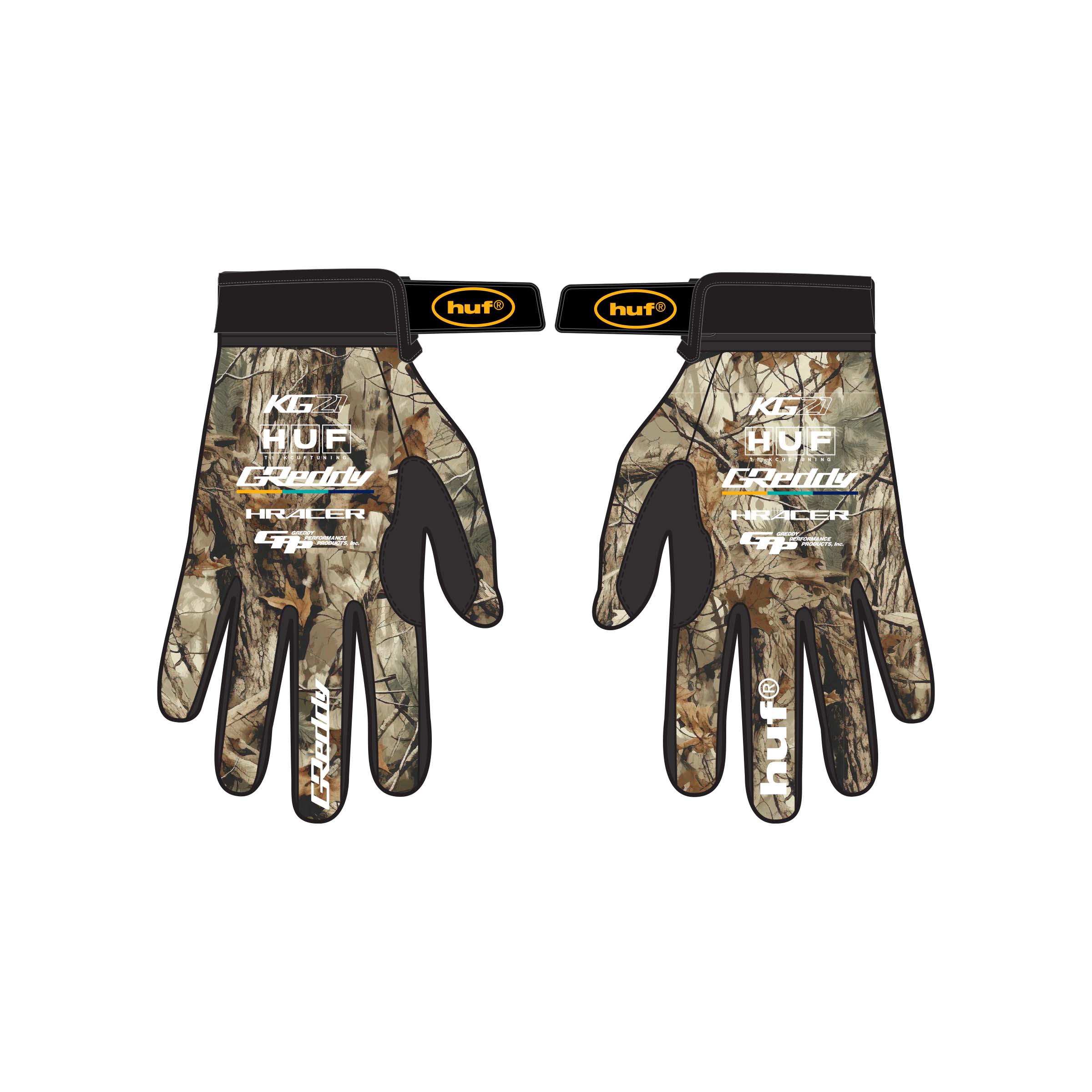 Realtree racing gloves with huf and greddy branding