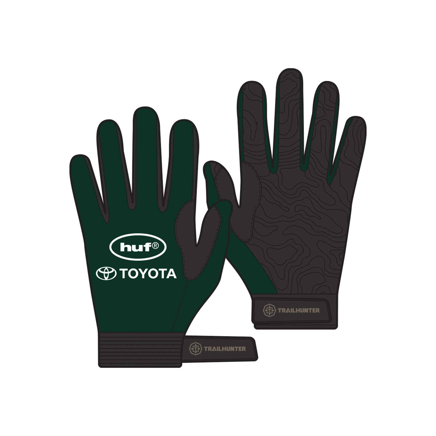 Sleek design with hidden tonal details, the HUF X Toyota Trailhunter gloves feature Everest-inspired colors, gel-printed artwork, and custom Trailhunter branded closure.