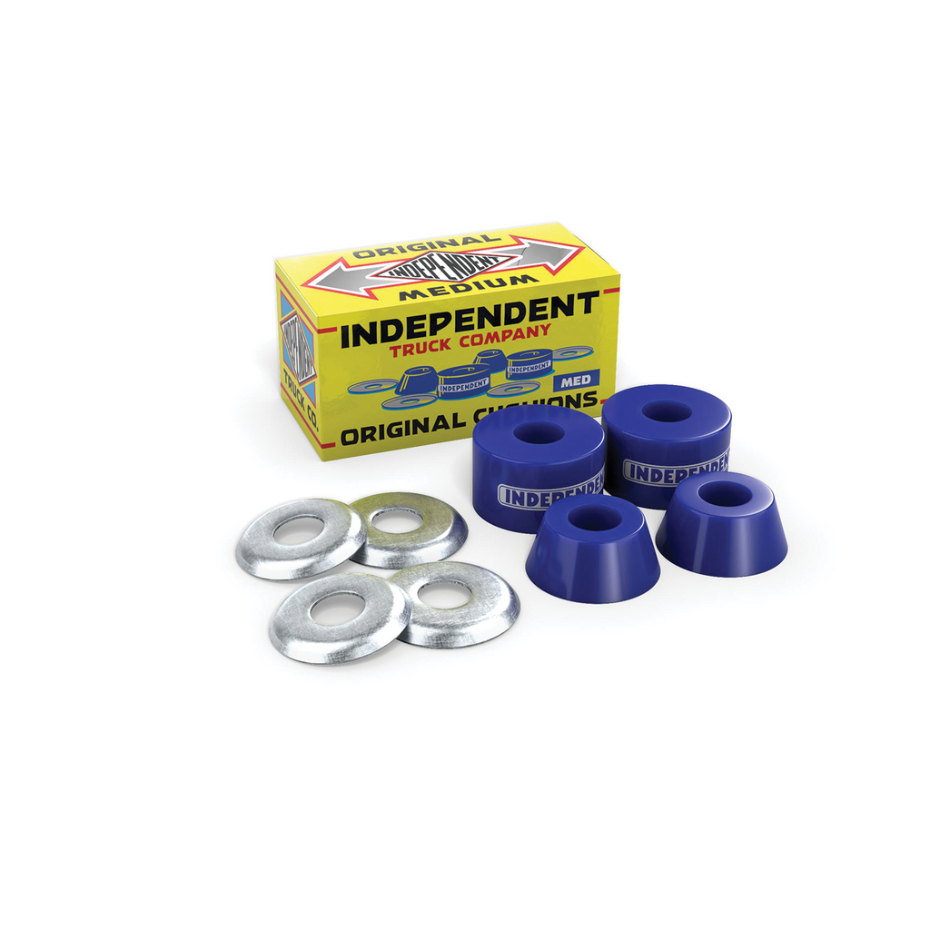Independent Original Cushions feature custom formulated ultra high rebound Genuine Parts urethane for superior stability and are sized perfectly to fit Independent Stages 1 through 7. Package comes with 2 top & 2 bottom cushions and cup washers. Available in Soft Red 90a, Medium Blue 92a, and Hard Black 94a.
